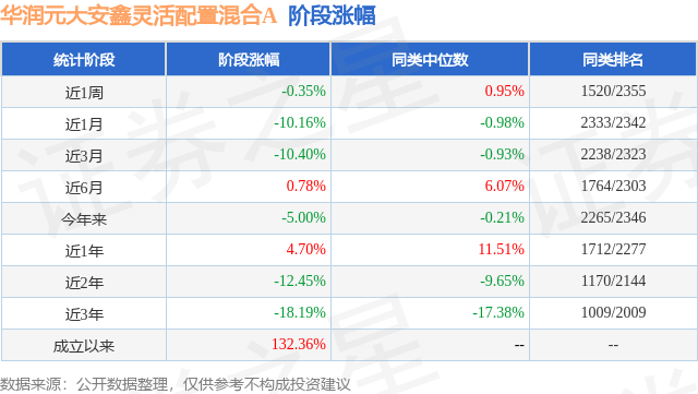 从业绩表现来看,华润元大安鑫灵活配置混合A基金过去一年净值涨幅为4.7%,在同类基金中排名1712/2277,同类基金过去一年净值涨幅中位数为11.51%。而基金过去一年的最大回撤为-20.66%,成立以来的最大回撤为-35.27%。