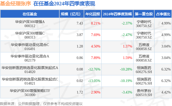 证券之星消息,日前华安沪深300增强A基金公布四季报,2024年四季度最新规模7.43亿元,季度净值涨幅为-2.37%。