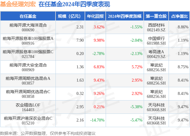 证券之星消息,日前前海开源股息率100强股票A基金公布四季报,2024年四季度最新规模7.9亿元,季度净值涨幅为-2.04%。