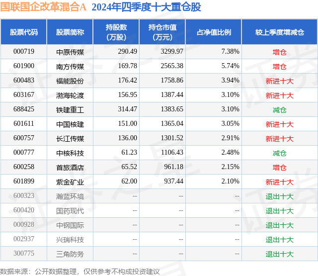 从基金规模来看,国联国企改革混合A基金2024年四季度公布的基金规模为1.72亿元,较上一期规模1.69亿元变化了360.23万元,环比变化了2.13%。该基金最新一期资产配置为:股票占净值比51.74%,无债券类资产,现金占净值比44.34%。从基金持仓来看,该基金当季前十大股票仓位达35.95%,第一大重仓股为中原传媒(000719),持仓占比为7.38%。