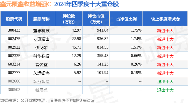 从基金规模来看,鑫元聚鑫收益增强C基金2024年四季度公布的基金规模为0.11亿元,较上一期规模2430.57万元变化了-1287.22万元,环比变化了-52.96%。该基金最新一期资产配置为:股票占净值比6.11%,债券占净值比61.19%,现金占净值比0.58%。从基金持仓来看,该基金当季前十大股票仓位达6.11%,第一大重仓股为蓝思科技(300433),持仓占比为1.75%。