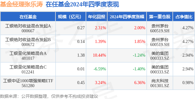工银绝对收益混合发起A现任基金经理为张乐涛。其中在任基金经理张乐涛已从业2年又340天,2022年2月18日正式接手管理工银绝对收益混合发起A,任职期间累计回报为-7.69%。目前还管理着5只基金产品(包括A类和C类),其中本季度表现最佳的基金为工银中证1000增强策略ETF(561280),季度净值涨幅为6.36%。