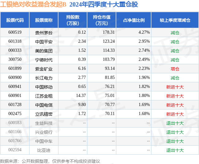 从基金规模来看,工银绝对收益混合发起B基金2024年四季度公布的基金规模为0.14亿元,较上一期规模1439.51万元变化了9.47万元,环比变化了0.66%。该基金最新一期资产配置为:股票占净值比67.77%,债券占净值比6.03%,现金占净值比10.79%。从基金持仓来看,该基金当季前十大股票仓位达23.63%,第一大重仓股为贵州茅台(600519),持仓占比为4.27%。