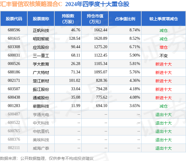 从基金规模来看,汇丰晋信双核策略混合C基金2024年四季度公布的基金规模为0.32亿元,较上一期规模2764.21万元变化了420.4万元,环比变化了15.21%。该基金最新一期资产配置为:股票占净值比93.33%,无债券类资产,现金占净值比7.53%。从基金持仓来看,该基金当季前十大股票仓位达57.71%,第一大重仓股为正帆科技(688596),持仓占比为8.74%。