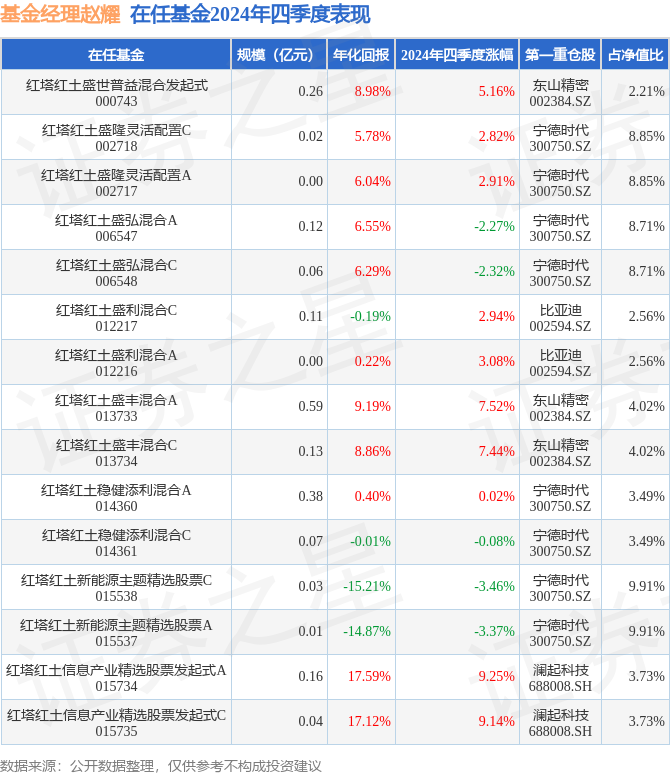 红塔红土盛世普益混合发起式现任基金经理为赵耀。其中在任基金经理赵耀已从业9年又265天,2024年9月29日正式接手管理红塔红土盛世普益混合发起式,任职期间累计回报为9.32%。目前还管理着15只基金产品(包括A类和C类),其中本季度表现最佳的基金为红塔红土信息产业精选股票发起式A(015734),季度净值涨幅为9.25%。