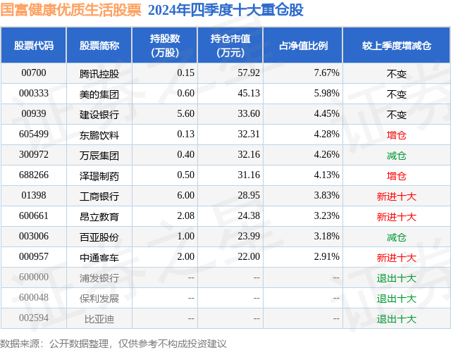 从基金规模来看,国富健康优质生活股票基金2024年四季度公布的基金规模为0.08亿元,较上一期规模817.45万元变化了-62.22万元,环比变化了-7.61%。该基金最新一期资产配置为:股票占净值比85.55%,债券占净值比6.75%,现金占净值比7.84%。从基金持仓来看,该基金当季前十大股票仓位达43.92%,第一大重仓股为腾讯控股(00700),持仓占比为7.67%。