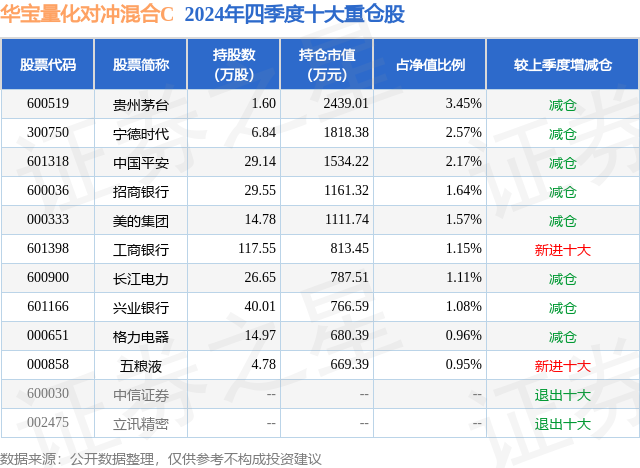 从基金规模来看,华宝量化对冲混合C基金2024年四季度公布的基金规模为2.41亿元,较上一期规模2.85亿元变化了-4332.9万元,环比变化了-15.22%。该基金最新一期资产配置为:股票占净值比70.05%,债券占净值比5.61%,现金占净值比13.36%。从基金持仓来看,该基金当季前十大股票仓位达16.65%,第一大重仓股为贵州茅台(600519),持仓占比为3.45%。