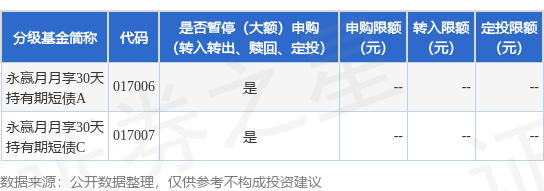 证券之星消息,1月23日永赢基金管理有限公司发布《永赢月月享30天持有期短债债券型证券投资基金暂停大额申购(含定期定额投资)、转换转入业务的公告》。公告中提示,为保障基金平稳运作,根据《永赢月月享30天持有期短债债券型证券投资基金基金合同》的有关规定,自2025年1月24日起永赢月月享30天持有期短债债券型证券投资基金暂停大额申购(含定期定额投资)、转换转入业务,申购、转换转入上限金额为10.0万元,下属分级基金调整明细如下: