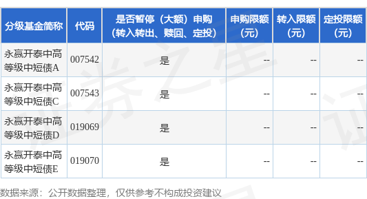证券之星消息,1月23日永赢基金管理有限公司发布《永赢开泰中高等级中短债债券型证券投资基金暂停大额申购(含定期定额投资)、转换转入业务的公告》。公告中提示,为保障基金平稳运作,根据《永赢开泰中高等级中短债债券型证券投资基金基金合同》的有关规定,自2025年1月24日起永赢开泰中高等级中短债债券型证券投资基金暂停大额申购(含定期定额投资)、转换转入业务,申购、转换转入上限金额为1000.0万元,下属分级基金调整明细如下: