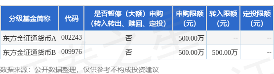 证券之星消息,1月23日东方基金管理股份有限公司发布《东方金证通货币市场基金暂停500万元以上(不含500万元)申购、转换转入、定期定额投资公告》。公告中提示,为了保证基金的平稳运作,保护基金份额持有人利益,自2025年1月24日起东方金证通货币市场基金暂停500万元以上(不含500万元)申购、转换转入、定期定额投资,下属分级基金调整明细如下: