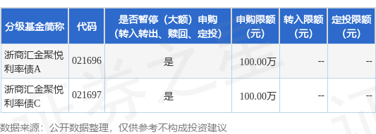 注:自2025年1月23日起,对浙商汇金聚悦利率债债券型证券投资基金(以下简称“本基金”)的大额申购业务进行限制,单个账户每一开放日申购不得超过100万元(不含100万元)。如单日单个基金账户单笔申购本基金的金额超过100万元(不含),则100万元确认申购成功,超过100万元(不含)的部分将确认失败。本基金恢复大额申购业务的具体时间将另行公告。