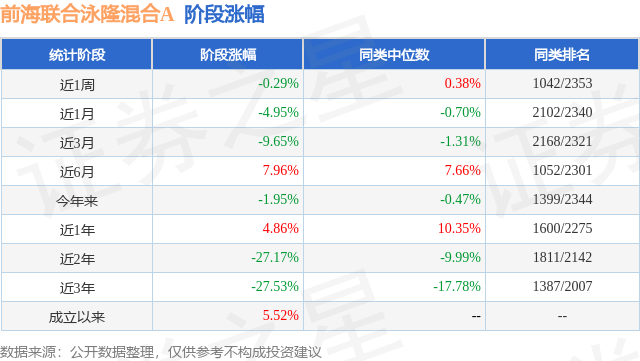 从业绩表现来看,前海联合泳隆混合A基金过去一年净值涨幅为4.86%,在同类基金中排名1600/2275,同类基金过去一年净值涨幅中位数为10.35%。而基金过去一年的最大回撤为-18.62%,成立以来的最大回撤为-53.79%。