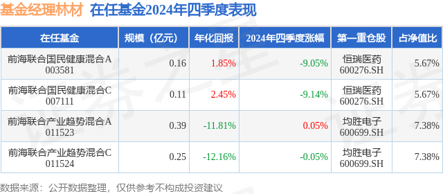 证券之星消息,日前前海联合国民健康混合C基金公布四季报,2024年四季度最新规模0.11亿元,季度净值涨幅为-9.14%。