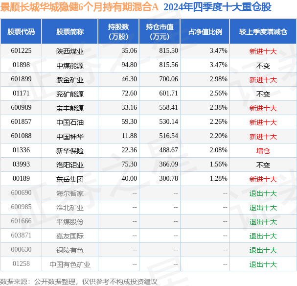 从基金规模来看,景顺长城华城稳健6个月持有期混合A基金2024年四季度公布的基金规模为1.53亿元,较上一期规模1.42亿元变化了1082.97万元,环比变化了7.64%。该基金最新一期资产配置为:股票占净值比33.7%,债券占净值比49.63%,现金占净值比18.16%。从基金持仓来看,该基金当季前十大股票仓位达24.24%,第一大重仓股为陕西煤业(601225),持仓占比为3.47%。
