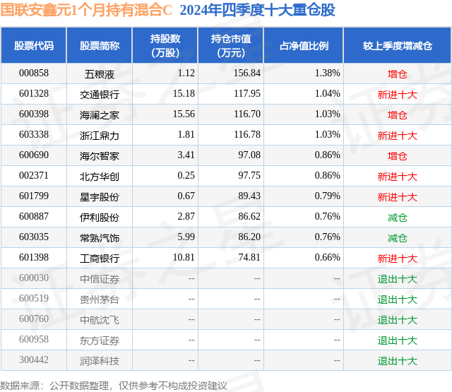 证券之星消息,日前国联安鑫元1个月持有混合C基金公布四季报,2024年四季度最新规模0.0亿元,季度净值涨幅为2.96%。