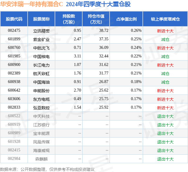 从基金规模来看,华安沣瑞一年持有混合C基金2024年四季度公布的基金规模为0.1亿元,较上一期规模1246.23万元变化了-295.44万元,环比变化了-23.71%。该基金最新一期资产配置为:股票占净值比6.92%,债券占净值比109.7%,现金占净值比1.39%。从基金持仓来看,该基金当季前十大股票仓位达2.08%,第一大重仓股为立讯精密(002475),持仓占比为0.26%。