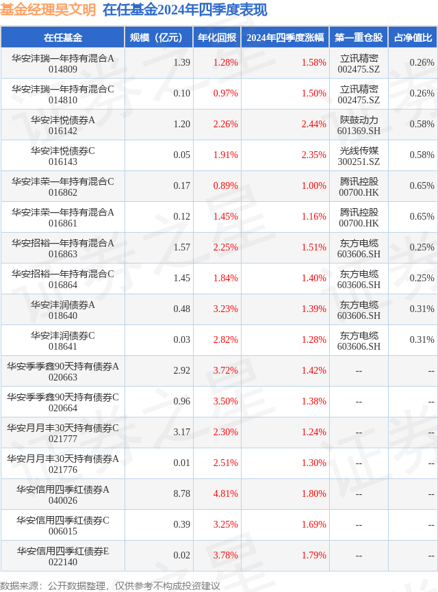 证券之星消息,日前华安沣瑞一年持有混合C基金公布四季报,2024年四季度最新规模0.1亿元,季度净值涨幅为1.5%。