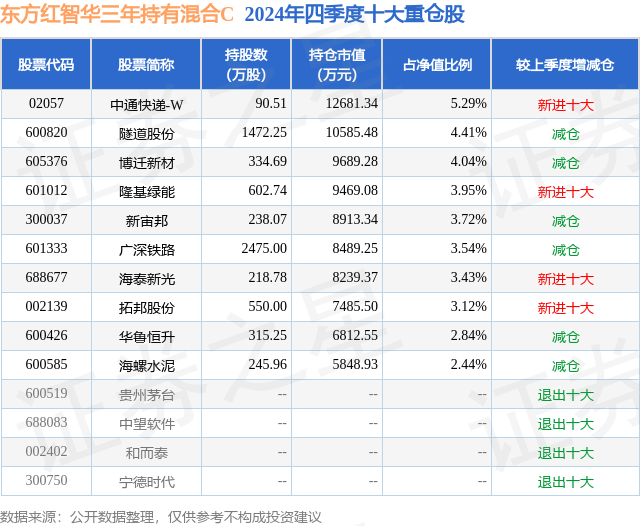 证券之星消息,日前东方红智华三年持有混合C基金公布四季报,2024年四季度最新规模0.52亿元,季度净值涨幅为1.38%。