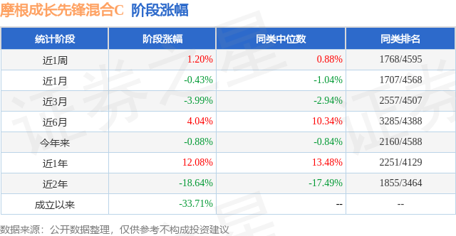 从业绩表现来看,摩根成长先锋混合C基金过去一年净值涨幅为12.08%,在同类基金中排名2251/4129,同类基金过去一年净值涨幅中位数为13.48%。而基金过去一年的最大回撤为-12.59%,成立以来的最大回撤为-44.83%。