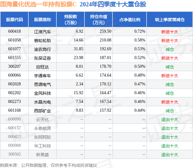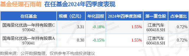 从基金规模来看,国海量化优选一年持有股票C基金2024年四季度公布的基金规模为3.31亿元,较上一期规模4.43亿元变化了-1.12亿元,环比变化了-25.21%。该基金最新一期资产配置为:股票占净值比89.3%,无债券类资产,现金占净值比11.68%。从基金持仓来看,该基金当季前十大股票仓位达5.16%,第一大重仓股为江淮汽车(600418),持仓占比为0.72%。