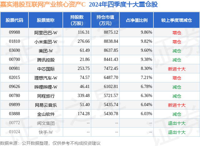 从基金规模来看,嘉实港股互联网产业核心资产C基金2024年四季度公布的基金规模为7.26亿元,较上一期规模7.42亿元变化了-1609.72万元,环比变化了-2.17%。该基金最新一期资产配置为:股票占净值比93.58%,债券占净值比5.97%,现金占净值比2.26%。从基金持仓来看,该基金当季前十大股票仓位达79.38%,第一大重仓股为阿里巴巴-W(09988),持仓占比为9.86%。
