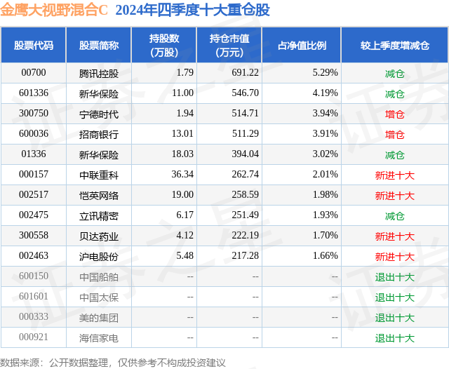 从基金规模来看,金鹰大视野混合C基金2024年四季度公布的基金规模为0.71亿元,较上一期规模7471.7万元变化了-419.33万元,环比变化了-5.61%。该基金最新一期资产配置为:股票占净值比94.41%,无债券类资产,现金占净值比0.11%。从基金持仓来看,该基金当季前十大股票仓位达29.63%,第一大重仓股为腾讯控股(00700),持仓占比为5.29%。