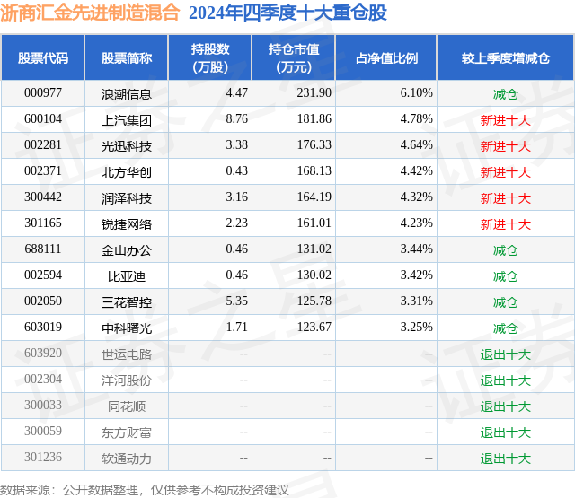 从基金规模来看,浙商汇金先进制造混合基金2024年四季度公布的基金规模为0.38亿元,较上一期规模3678.96万元变化了124.64万元,环比变化了3.39%。该基金最新一期资产配置为:股票占净值比85.9%,无债券类资产,现金占净值比25.73%。从基金持仓来看,该基金当季前十大股票仓位达41.91%,第一大重仓股为浪潮信息(000977),持仓占比为6.1%。