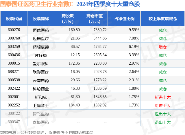 从基金规模来看,国泰国证医药卫生行业指数C基金2024年四季度公布的基金规模为0.24亿元,较上一期规模2305.19万元变化了130.17万元,环比变化了5.65%。该基金最新一期资产配置为:股票占净值比93.39%,债券占净值比2.31%,现金占净值比4.53%。从基金持仓来看,该基金当季前十大股票仓位达39.45%,第一大重仓股为恒瑞医药(600276),持仓占比为9.59%。
