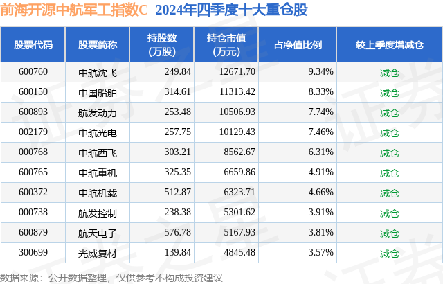 从基金规模来看,前海开源中航军工指数C基金2024年四季度公布的基金规模为1.72亿元,较上一期规模1.44亿元变化了2827.34万元,环比变化了19.68%。该基金最新一期资产配置为:股票占净值比94.42%,债券占净值比2.07%,现金占净值比4.4%。从基金持仓来看,该基金当季前十大股票仓位达60.04%,第一大重仓股为中航沈飞(600760),持仓占比为9.34%。