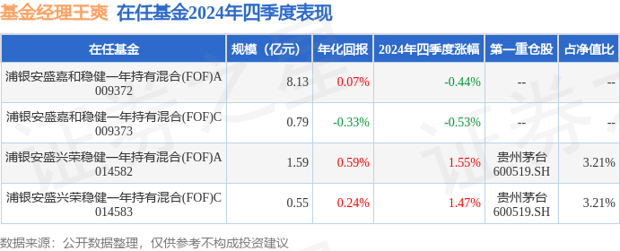 从基金规模来看,浦银安盛兴荣稳健一年持有混合(FOF)C基金2024年四季度公布的基金规模为0.55亿元,较上一期规模7235.15万元变化了-1727.8万元,环比变化了-23.88%。该基金最新一期资产配置为:股票占净值比5.23%,债券占净值比5.53%,现金占净值比3.19%。从基金持仓来看,该基金当季前十大股票仓位达5.24%,第一大重仓股为贵州茅台(600519),持仓占比为3.21%。