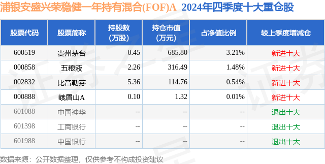 从基金规模来看,浦银安盛兴荣稳健一年持有混合(FOF)A基金2024年四季度公布的基金规模为1.59亿元,较上一期规模2.48亿元变化了-8933.37万元,环比变化了-36.02%。该基金最新一期资产配置为:股票占净值比5.23%,债券占净值比5.53%,现金占净值比3.19%。从基金持仓来看,该基金当季前十大股票仓位达5.24%,第一大重仓股为贵州茅台(600519),持仓占比为3.21%。