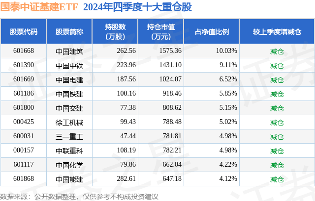 从基金规模来看,国泰中证基建ETF基金2024年四季度公布的基金规模为1.57亿元,较上一期规模2.06亿元变化了-4855.29万元,环比变化了-23.62%。该基金最新一期资产配置为:股票占净值比99.1%,无债券类资产,现金占净值比0.96%。从基金持仓来看,该基金当季前十大股票仓位达59.98%,第一大重仓股为中国建筑(601668),持仓占比为10.03%。