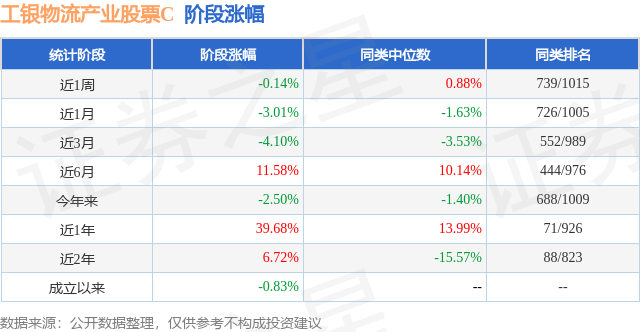 从业绩表现来看,工银物流产业股票C基金过去一年净值涨幅为39.68%,在同类基金中排名71/926,同类基金过去一年净值涨幅中位数为13.99%。而基金过去一年的最大回撤为-11.75%,成立以来的最大回撤为-30.81%。