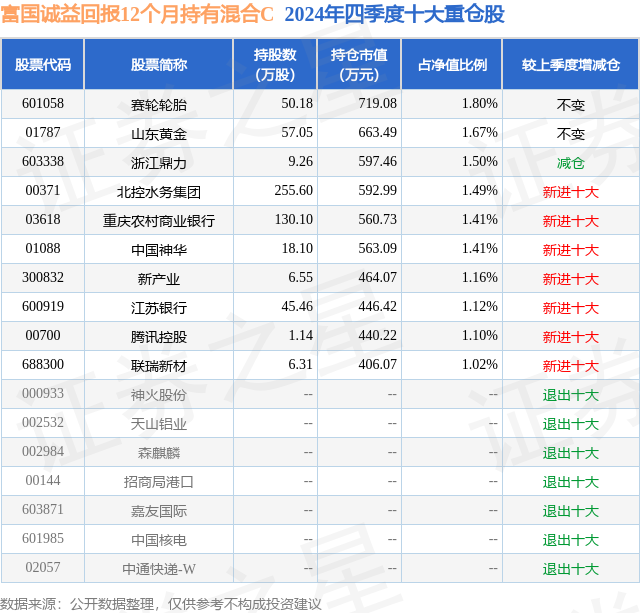 证券之星消息,日前富国诚益回报12个月持有混合C基金公布四季报,2024年四季度最新规模1.8亿元,季度净值涨幅为-1.47%。