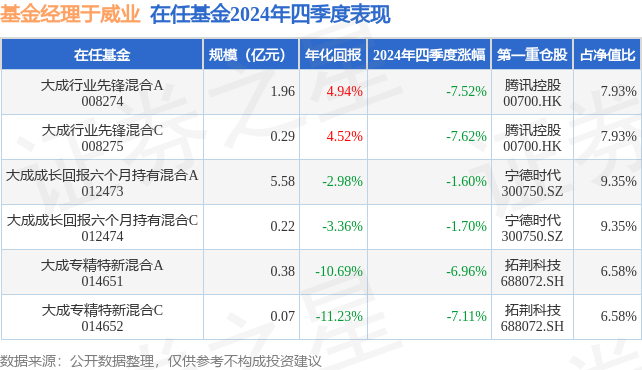 证券之星消息,日前大成专精特新混合C基金公布四季报,2024年四季度最新规模0.07亿元,季度净值涨幅为-7.11%。