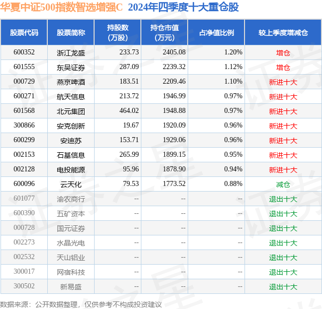 从基金规模来看,华夏中证500指数智选增强C基金2024年四季度公布的基金规模为4.68亿元,较上一期规模4.55亿元变化了1256.68万元,环比变化了2.76%。该基金最新一期资产配置为:股票占净值比94.08%,无债券类资产,现金占净值比8.33%。从基金持仓来看,该基金当季前十大股票仓位达10.05%,第一大重仓股为浙江龙盛(600352),持仓占比为1.2%。