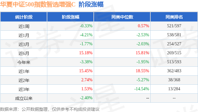 从业绩表现来看,华夏中证500指数智选增强C基金过去一年净值涨幅为15.45%,在同类基金中排名362/483,同类基金过去一年净值涨幅中位数为18.55%。而基金过去一年的最大回撤为-18.34%,成立以来的最大回撤为-32.68%。