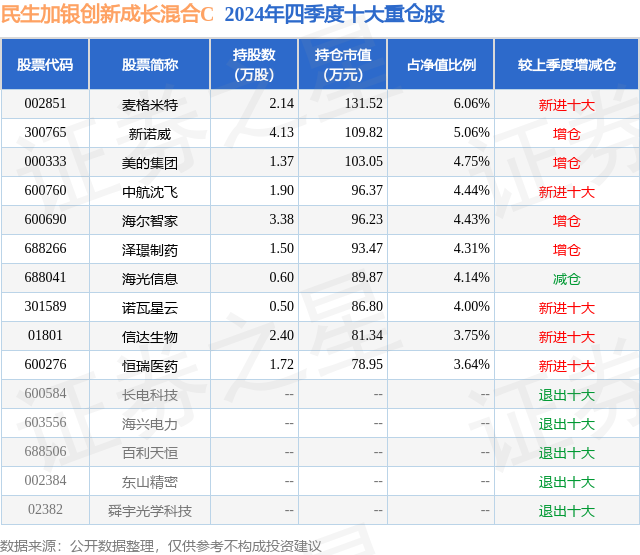 证券之星消息,日前民生加银创新成长混合C基金公布四季报,2024年四季度最新规模0.02亿元,季度净值涨幅为-4.62%。
