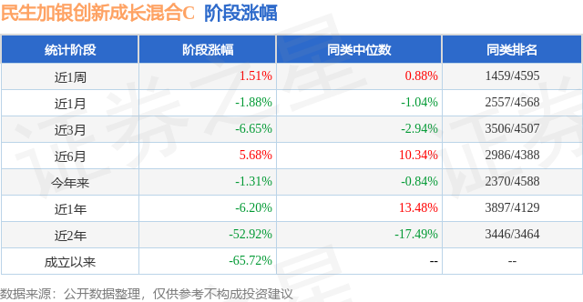 从业绩表现来看,民生加银创新成长混合C基金过去一年净值涨幅为-6.2%,在同类基金中排名3897/4129,同类基金过去一年净值涨幅中位数为13.48%。而基金过去一年的最大回撤为-32.65%,成立以来的最大回撤为-71.14%。