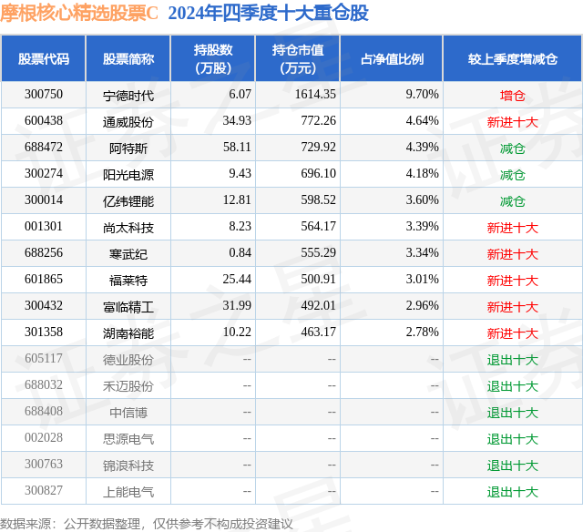 从基金规模来看,摩根核心精选股票C基金2024年四季度公布的基金规模为0.05亿元,较上一期规模702.65万元变化了-155.53万元,环比变化了-22.13%。该基金最新一期资产配置为:股票占净值比89.8%,无债券类资产,现金占净值比11.34%。从基金持仓来看,该基金当季前十大股票仓位达41.99%,第一大重仓股为宁德时代(300750),持仓占比为9.7%。
