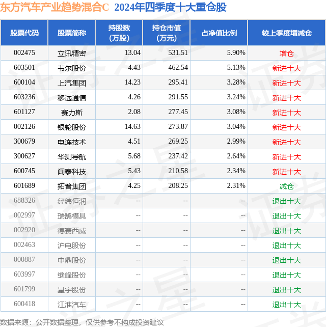 从基金规模来看,东方汽车产业趋势混合C基金2024年四季度公布的基金规模为0.35亿元,较上一期规模4425.88万元变化了-901.96万元,环比变化了-20.38%。该基金最新一期资产配置为:股票占净值比84.39%,债券占净值比6.18%,现金占净值比1.05%。从基金持仓来看,该基金当季前十大股票仓位达33.95%,第一大重仓股为立讯精密(002475),持仓占比为5.9%。