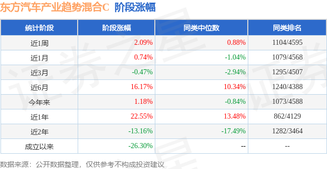 从业绩表现来看,东方汽车产业趋势混合C基金过去一年净值涨幅为22.55%,在同类基金中排名862/4129,同类基金过去一年净值涨幅中位数为13.48%。而基金过去一年的最大回撤为-19.6%,成立以来的最大回撤为-53.24%。