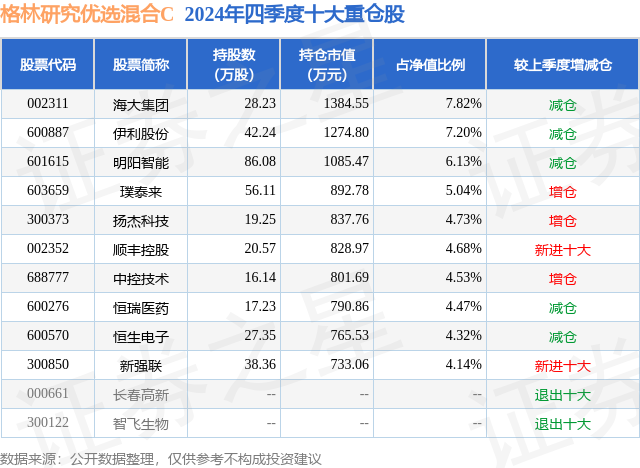 从基金规模来看,格林研究优选混合C基金2024年四季度公布的基金规模为0.38亿元,较上一期规模3587.59万元变化了172.13万元,环比变化了4.8%。该基金最新一期资产配置为:股票占净值比93.64%,无债券类资产,现金占净值比6.68%。从基金持仓来看,该基金当季前十大股票仓位达53.06%,第一大重仓股为海大集团(002311),持仓占比为7.82%。