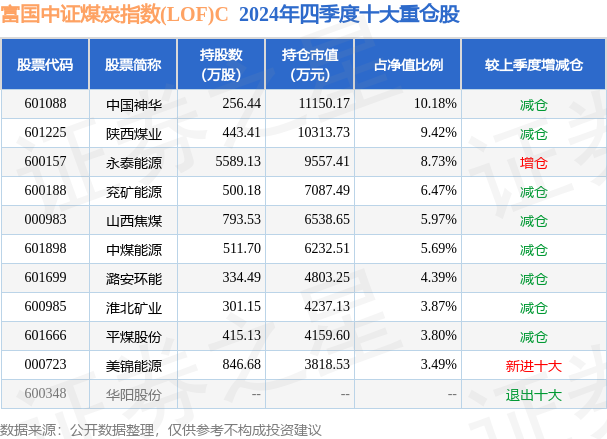从基金规模来看,富国中证煤炭指数(LOF)C基金2024年四季度公布的基金规模为4.47亿元,较上一期规模4.72亿元变化了-2436.77万元,环比变化了-5.16%。该基金最新一期资产配置为:股票占净值比94.18%,无债券类资产,现金占净值比6.11%。从基金持仓来看,该基金当季前十大股票仓位达62.01%,第一大重仓股为中国神华(601088),持仓占比为10.18%。