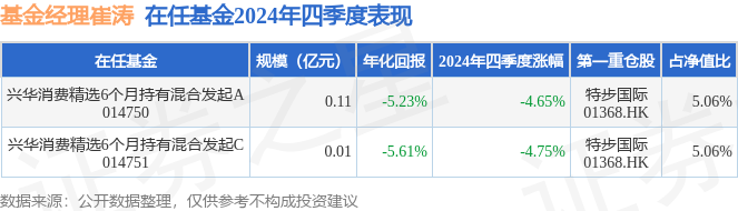 证券之星消息,日前兴华消费精选6个月持有混合发起A基金公布四季报,2024年四季度最新规模0.11亿元,季度净值涨幅为-4.65%。