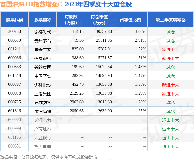 从基金规模来看,富国沪深300指数增强C基金2024年四季度公布的基金规模为25.29亿元,较上一期规模39.63亿元变化了-14.35亿元,环比变化了-36.2%。该基金最新一期资产配置为:股票占净值比93.65%,无债券类资产,现金占净值比6.79%。从基金持仓来看,该基金当季前十大股票仓位达17.06%,第一大重仓股为宁德时代(300750),持仓占比为3.0%。