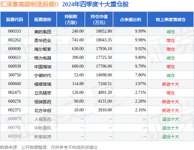 证券之星消息,日前汇添富高端制造股票D基金公布四季报,2024年四季度最新规模1.16亿元,季度净值涨幅为-2.91%。