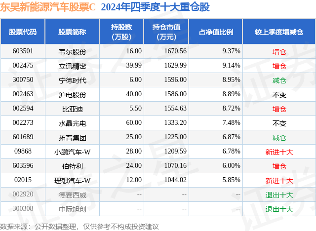 证券之星消息,日前东吴新能源汽车股票C基金公布四季报,2024年四季度最新规模1.03亿元,季度净值涨幅为0.52%。