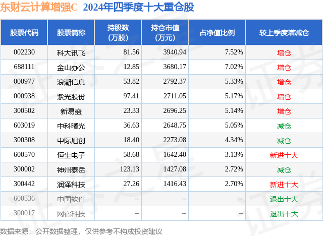 从基金规模来看,东财云计算增强C基金2024年四季度公布的基金规模为3.23亿元,较上一期规模2.81亿元变化了4214.3万元,环比变化了14.98%。该基金最新一期资产配置为:股票占净值比95.14%,无债券类资产,现金占净值比6.15%。从基金持仓来看,该基金当季前十大股票仓位达48.12%,第一大重仓股为科大讯飞(002230),持仓占比为7.52%。