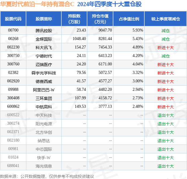 从基金规模来看,华夏时代前沿一年持有混合C基金2024年四季度公布的基金规模为2.53亿元,较上一期规模2.69亿元变化了-1573.34万元,环比变化了-5.86%。该基金最新一期资产配置为:股票占净值比80.1%,无债券类资产,现金占净值比21.11%。从基金持仓来看,该基金当季前十大股票仓位达38.96%,第一大重仓股为腾讯控股(00700),持仓占比为5.93%。